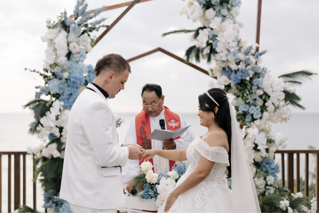 Latar belakang laut terbuka dan langit mendung menciptakan suasana tenang dan reflektif, sementara rangkaian bunga hydrangea biru dan anggrek putih memberi kesan elegan yang tetap alami. Struktur altar geometris dari kayu memberi sentuhan modern dan minimalis, menjadikan keseluruhan tampilan tampak bersih namun berkarakter.