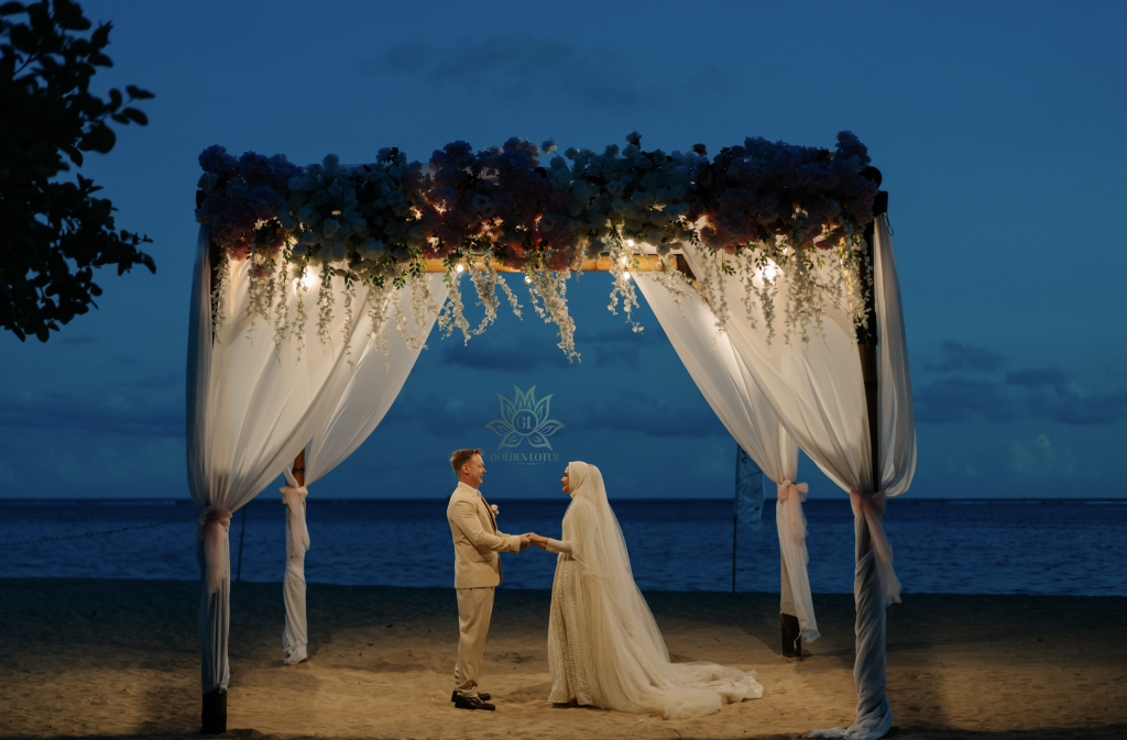 Pernikahan di pantai selalu memiliki daya pikat yang sulit diabaikan. Ketika dua orang berdiri di tepi lautan yang luas, seolah-olah mereka sedang menantang semesta bersama, mengucap janji yang tak tergoyahkan oleh gelombang dan waktu. Hamparan pasir putih yang membentang, langit luas tanpa batas, dan suara ombak yang datang silih berganti menciptakan simfoni alami yang mengiringi setiap kata dalam prosesi pernikahan. Pantai bukan hanya sebuah lokasi, tapi sebuah perasaan. Di sana, tidak ada sekat antara manusia dan alam; hanya ada kejujuran, kesederhanaan, dan keindahan yang murni. Angin laut yang lembut menyapu gaun pengantin, matahari yang perlahan tenggelam memberikan semburat keemasan pada kulit, dan kaki yang menginjak pasir memberi kesan bumi turut merestui cinta yang tumbuh. Suasana ini menciptakan kedekatan emosional yang mendalam, bukan hanya antara kedua mempelai, tetapi juga dengan para tamu yang hadir. Mereka tidak hanya menyaksikan sebuah pernikahan, tetapi ikut merasakan sebuah perjalanan—sebuah awal baru yang dikelilingi keindahan tak terbantahkan.