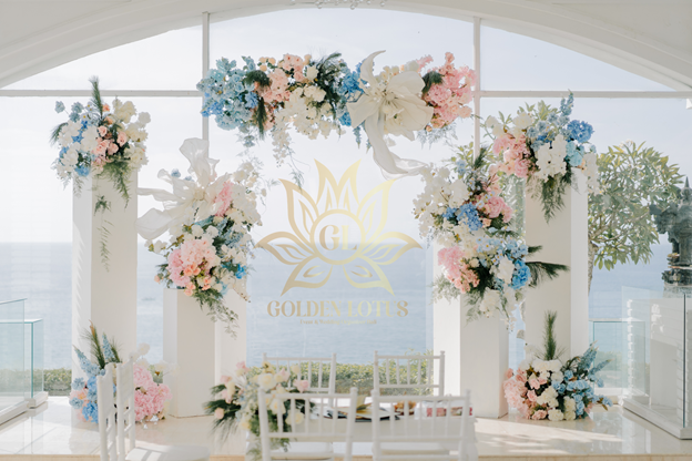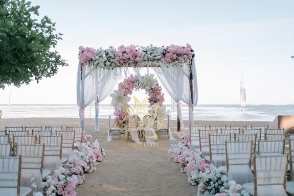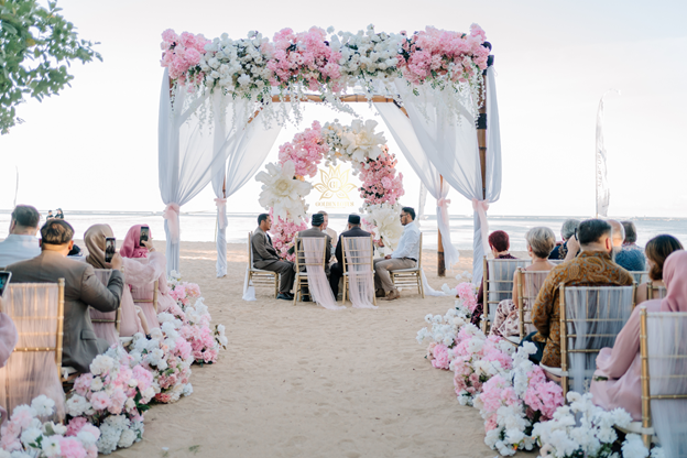 Dekorasi beach wedding biasanya menampilkan perpaduan elemen alami seperti tirai putih, rangkaian bunga pastel, lorong bunga, dan kursi tamu berbalut kain lembut yang menciptakan suasana romantis, elegan, dan menyatu dengan pemandangan laut.