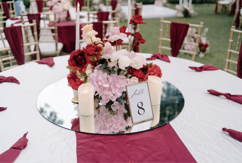Sementara itu, untuk pesta outdoor, maroon dapat dikombinasikan dengan elemen alami seperti kayu, tanaman hijau, dan bunga-bunga kering. Warna ini menyatu sempurna dengan nuansa rustic maupun glam. Tambahan lilin tinggi, lampu gantung antik, atau standing flower bernuansa merah tua akan memperkuat tema. Jangan lupa sematkan warna ini dalam elemen-elemen kecil seperti signage, kursi tamu, hingga hiasan gelas untuk kesan yang menyeluruh dan estetis.