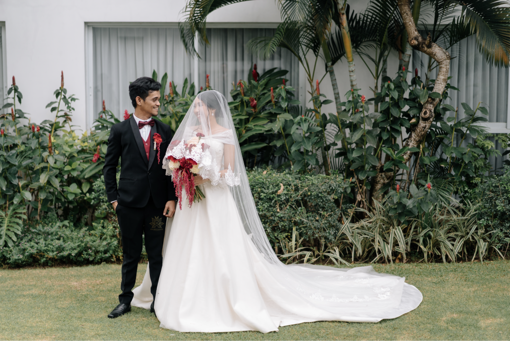 Bicara soal busana, maroon adalah warna yang dapat menciptakan tampilan yang sangat menawan. Pengantin wanita yang mengenakan gaun putih dengan detail maroon—seperti bordir bunga, sash, atau veil—akan tampil anggun dengan sentuhan unik. Bahkan, mengenakan gaun full-maroon menjadi pilihan berani bagi pengantin yang ingin tampil beda namun tetap elegan. Kain satin, tulle, atau organza dengan nuansa maroon mampu menangkap cahaya dan memberikan dimensi dramatis pada setiap langkah pengantin.