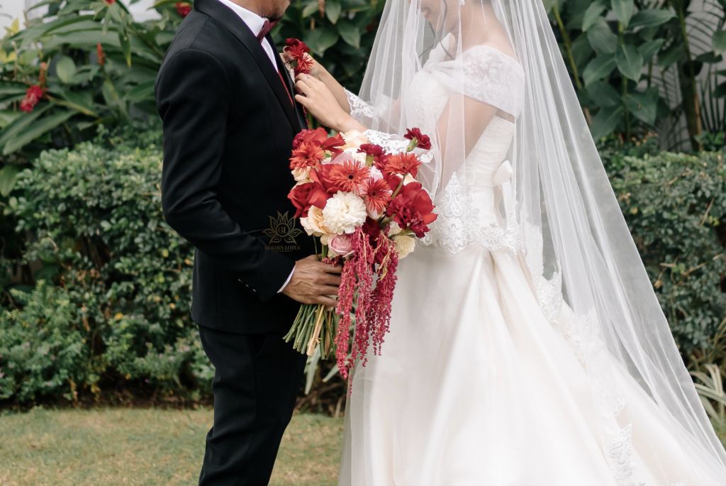Rangkaian bunga ini bisa diaplikasikan dalam berbagai bentuk, mulai dari buket pengantin, centerpieces di meja tamu, hingga bunga gantung di langit-langit. Bahkan, aksen bunga kecil di panggung pelaminan atau dekorasi kursi tamu akan membawa tema ini menyatu secara harmonis. Tak kalah penting, boutonniere pengantin pria dan keluarga bisa dirancang dengan bunga maroon mini yang elegan—sebuah sentuhan kecil yang menambah kesempurnaan tema.